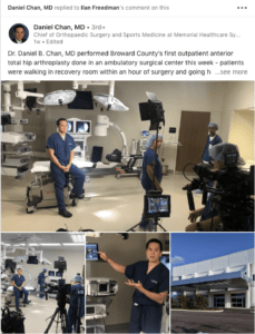 Dr. Daniel B. Chan, MD performed Broward County’s first outpatient anterior total hip arthroplasty done in an ambulatory surgical center this week – patients were walking in the recovery room within an hour of surgery and going home within 2-3 hours after surgery. Advanced technologies such as the Hana orthopedic table, the Kincise surgical impactor, and the JointPoint navigation system were all utilized to ensure a smooth and accurate hip reconstruction. Rapid recovery joint replacement is definitely a reality – let us help move you forward on your journey to reclaim your quality of life! Stay tuned for more information in the coming weeks regarding this new program.